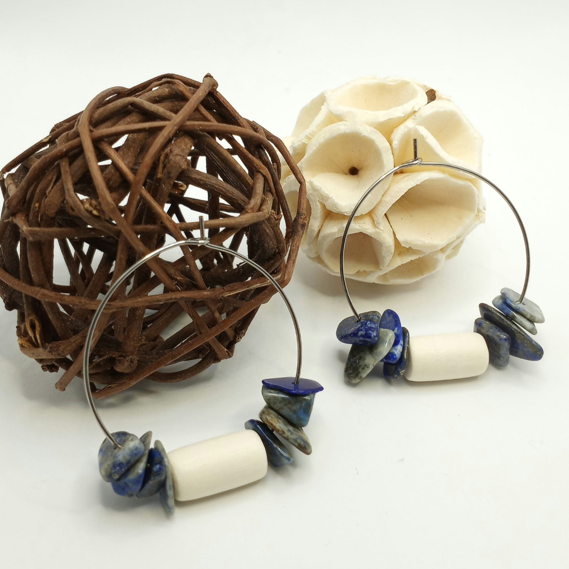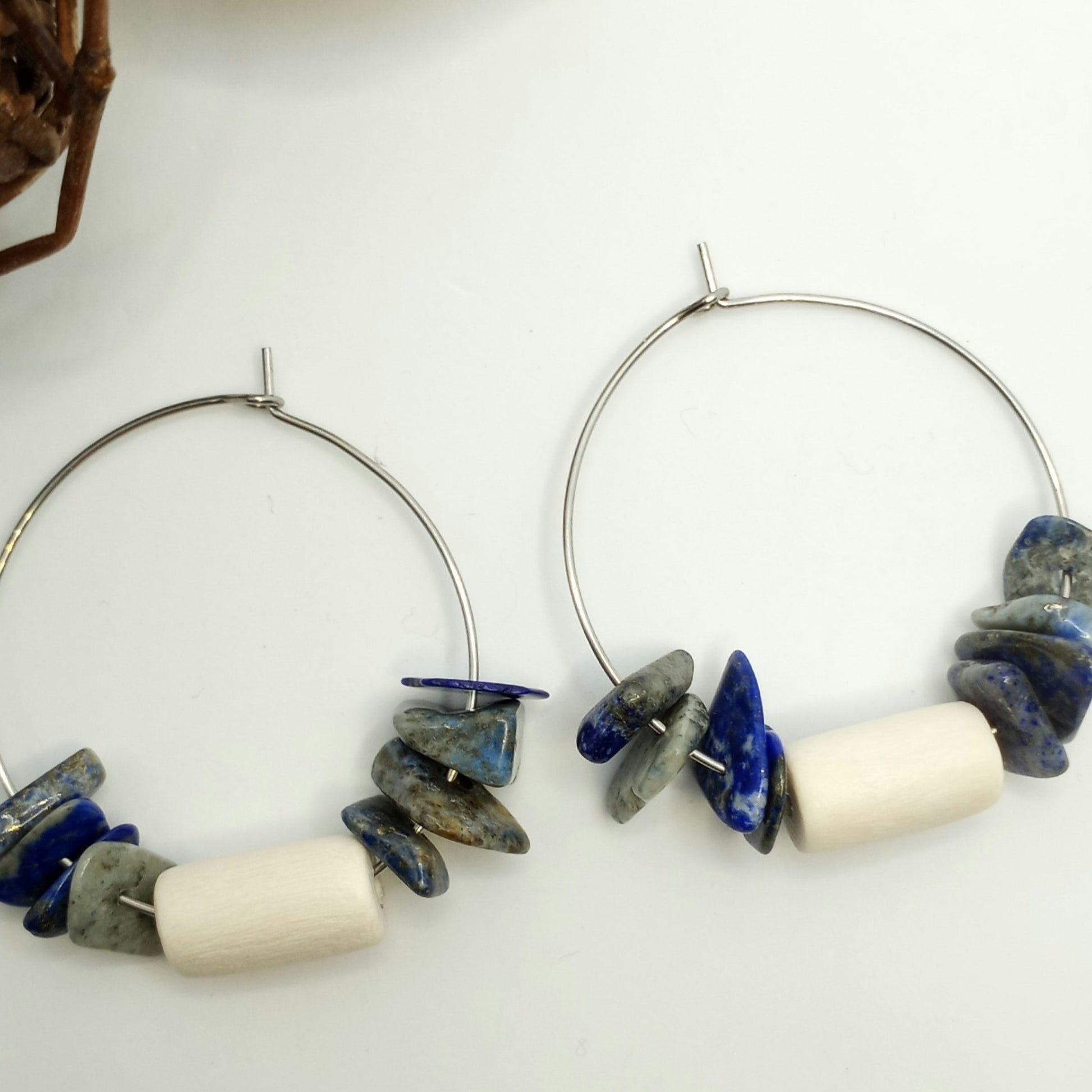 Materials Used- Handmade Hoops, Hypoallergenic Stainless Steel Small Hoop Earrings. Adorned With Lapis Lazuli Gemstones And Wood.
